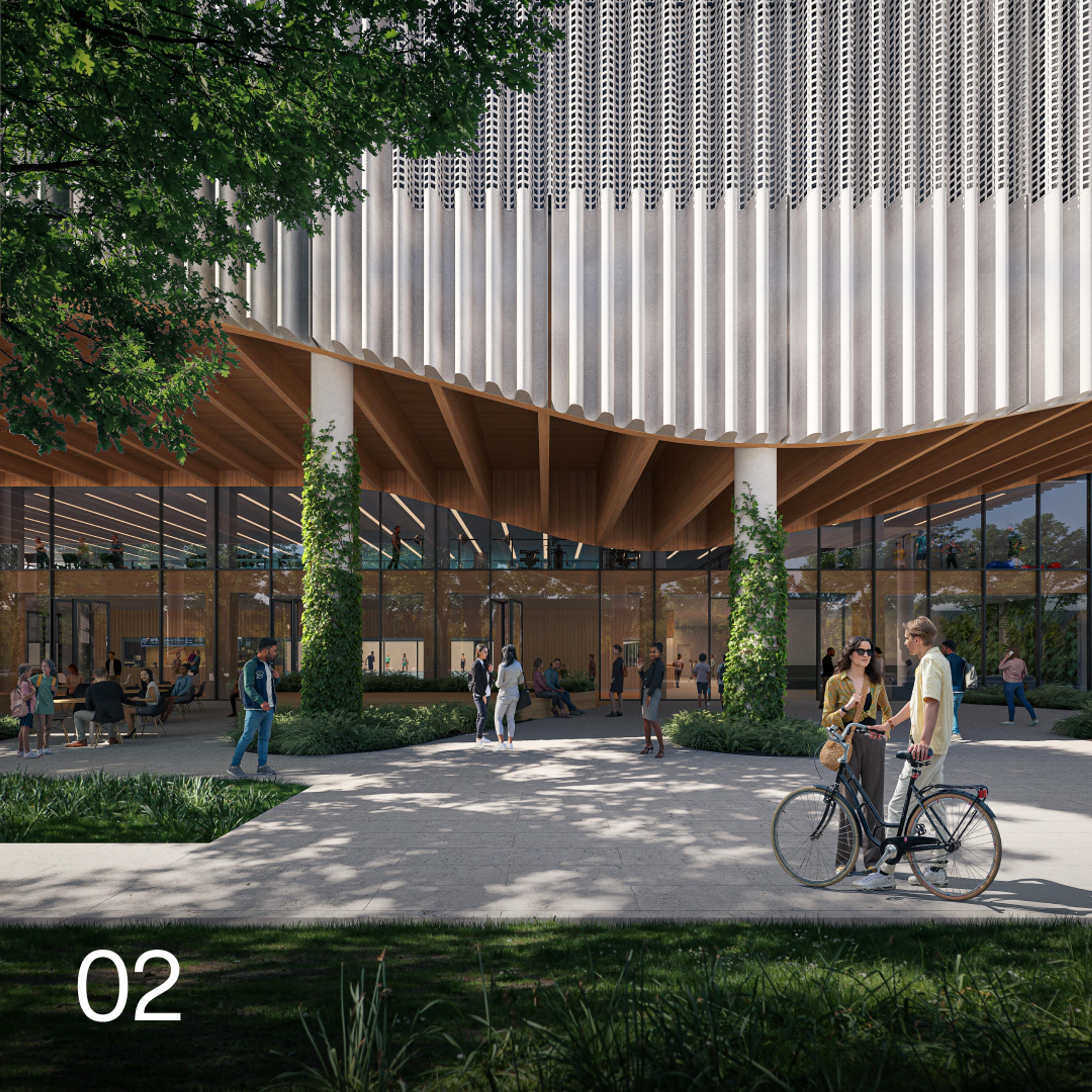 The vertical design of the centre includes five indoor multi-purpose courts (stacked over three floors), a 24-hour gymnasium, storage and change rooms, a cafe and lounge area, plus community facilities.