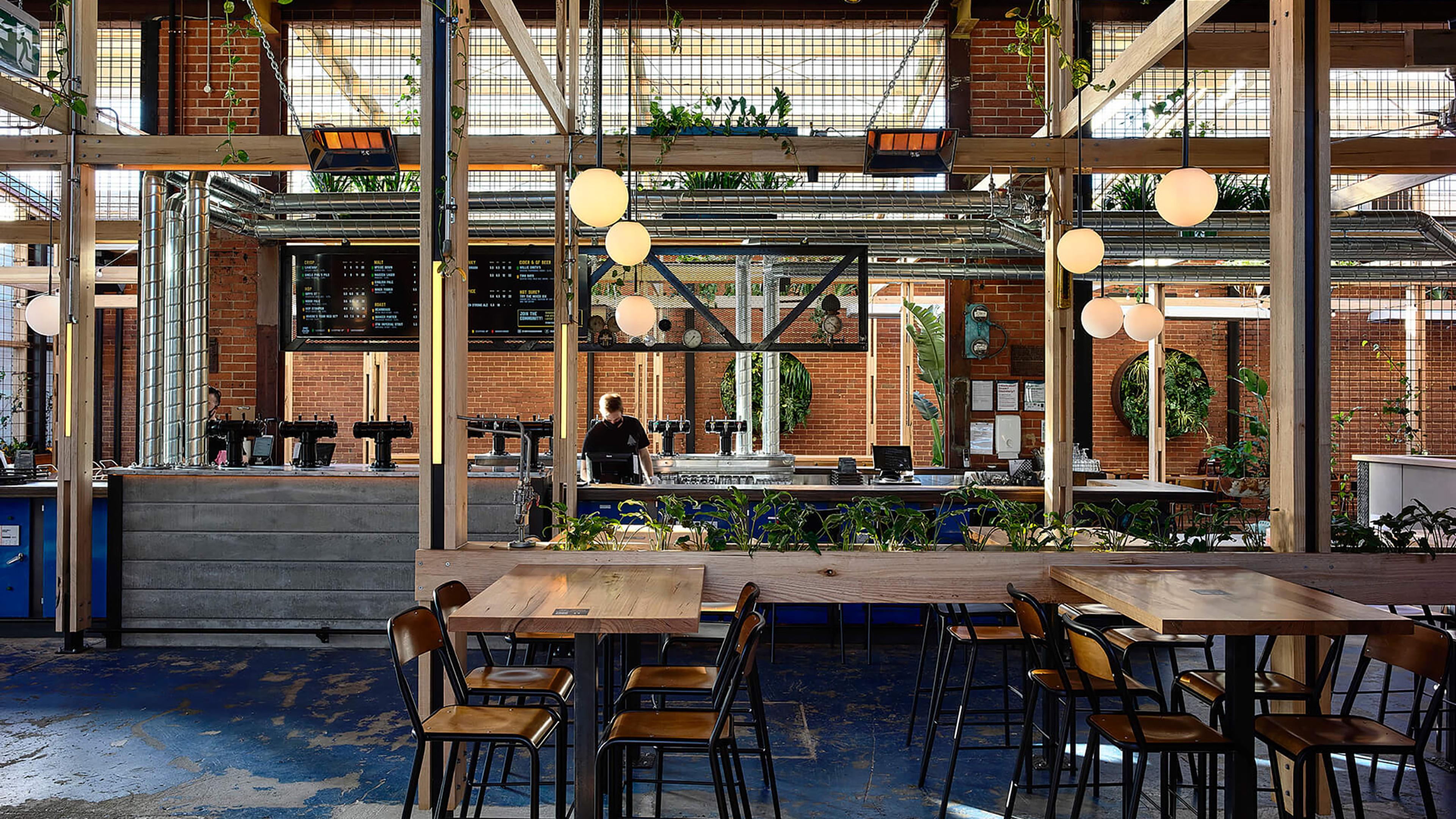 Hospitality and RetailLocated within a repurposed warehouse, the Stomping Ground Moorabbin fitout transforms an industrial space into a vibrant, community-focused venue. The design retains original features such as exposed brick, recycled timber and structural steel, complemented by high ceilings, communal tables and a retractable roof. Krneta provided building surveying services to support the adaptive reuse and ensure compliance with accessibility and safety standards.